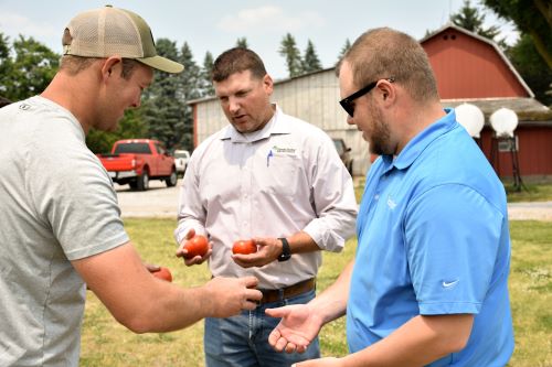 Tye shares his tomato plants with Mark Buuck and Rich Dubke, two financial services officers with GreenStone.