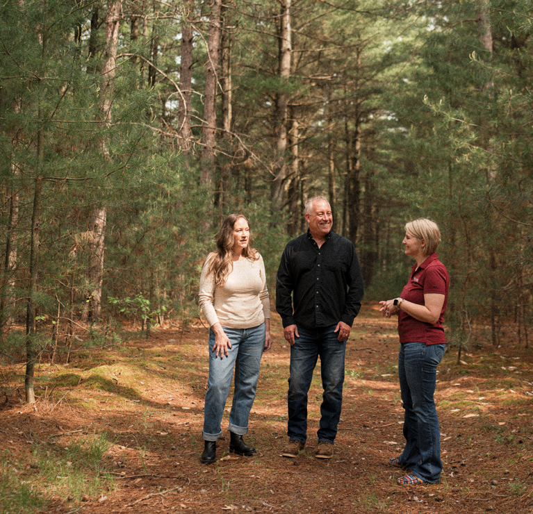 The Boomers stand amidst the pine trees on their new property with Financial Services Officer Stacy Stinson, who helped ensure they had everything they needed for a smooth closing.