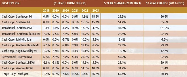 The Saginaw Valley cash crop land did not see an increase in value for 2023, after seeing a more than 16% jump in value last year. It represents a historically strong agricultural area; this surprising stagnation may be an early indication of plateauing land values to come in other agriculturally rich communities.
