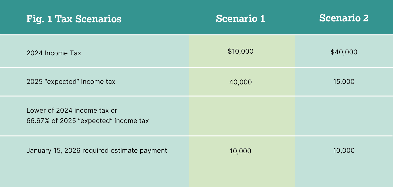 Balances due at the completion of the tax return would be offset by these January estimated payments made. For example, in scenario 2, if the tax return were finalized and the farmer had income tax of $15,000 per the tax return, the $5,000 balance would be owed as of the filing date — typically April 15.